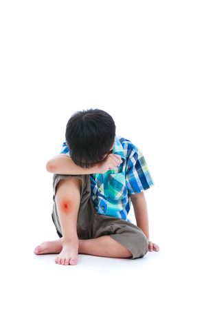 少し悲しい少年の裸足を床に座って 白い背景上に分離 人間の感情を否定します 暖かさと愛情に欠けている子供 捨てられた子供たちに関する概念 フリー フォーム コピー スペース の写真素材 画像素材 Image